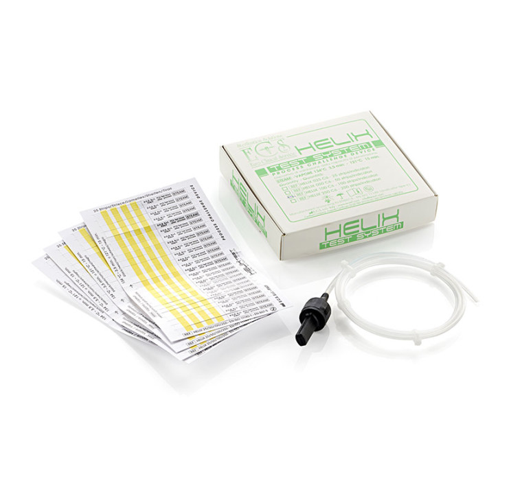 This Helix Test for Class B autoclaves consists of a PTFE spiral tube connected to a sealed Moplen chamber. It reacts after 3.5 minutes at a temperature of 134 °C, or after 15 minutes at 121 °C.