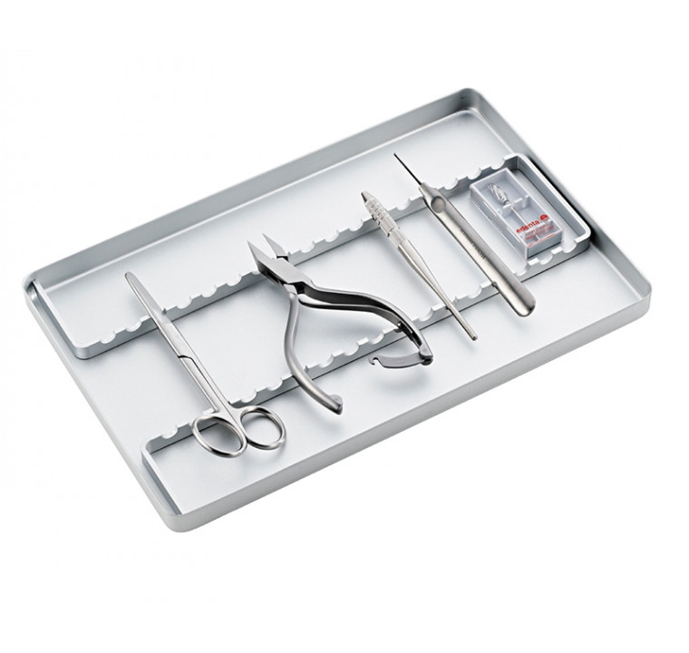 The ALUMINIUM INSTRUMENT HOLDER is compatible with the aluminium tray used during podiatric treatments.