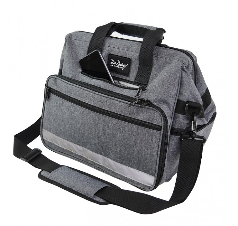 - 1 poche ventrale (40cmx20cm) s'ouvrant complétement avec d'un côté 2 filets de rangements zippés et 2 poches plates, et de l'autre plusieurs boucles élastiques permettant de ranger les petites fournitures de soins : pinces, ciseaux, lampe-stylo, thermomètre, bandages, stylos…