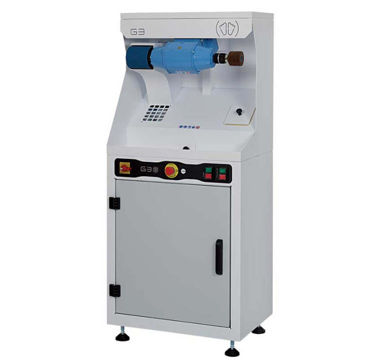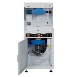 This sanding machine has a streamlined sanding cabinet with integrated 78db (A) turbine extraction and 2 sanding stations facing the spindle: