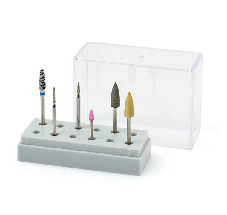 This plastic stand (12 holes) with lid for non-autoclavable burs contains the following burs: