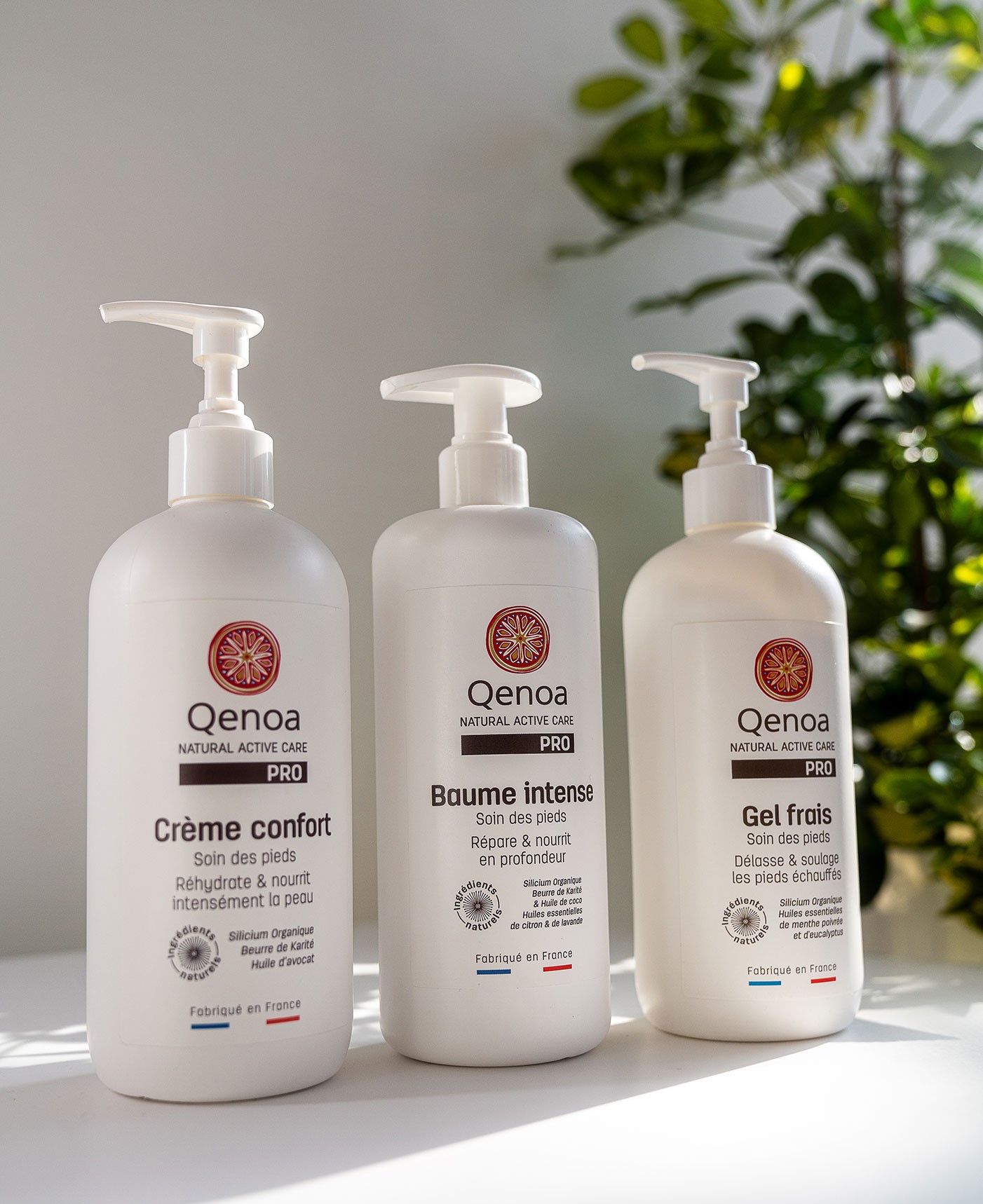 Nous avons développé une gamme professionnelle de crèmes et baumes naturels Qenoa pour prendre soin des pieds de vos patients à la fin de chaque consultation.