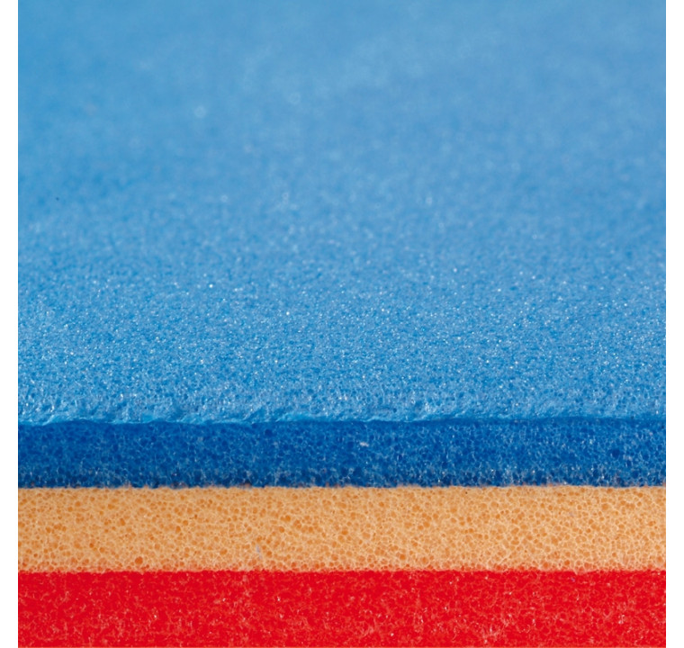 Cette plaque complexée est composée d'un recouvrement en PODIALENE™ 50 3mm de couleur bleu, d'un intermédiaire PODIAMIC® 160 MP 3mm de couleur chair et d'une base en PODIALENE™ 125 3mm de couleur rouge.